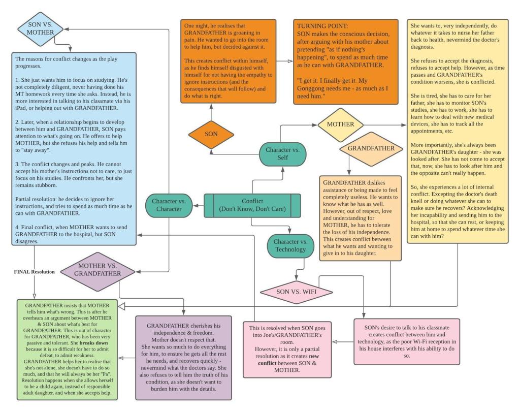 In the play “Don’t Know, Don’t Care” by Haresh Sharma, there are 3 types of conflict presented, with various resolutions: Character vs. Self, Character vs. Character, and Character vs. Technology.